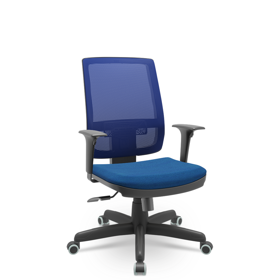 O modelo conta ainda com apoio lombar ajustável, braços reguláveis e pistão a gás para ajuste de altura, garantindo adaptação ergonômica para diferentes usuários.