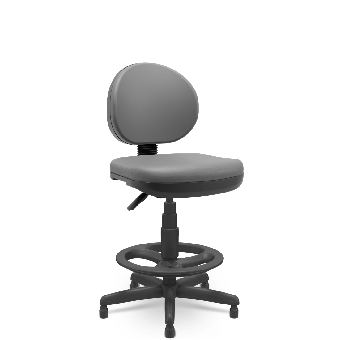 O modelo acompanha aro de apoio para os pés com regulagem de altura, permitindo ajuste adequado à estatura do usuário e à altura da estação de trabalho.