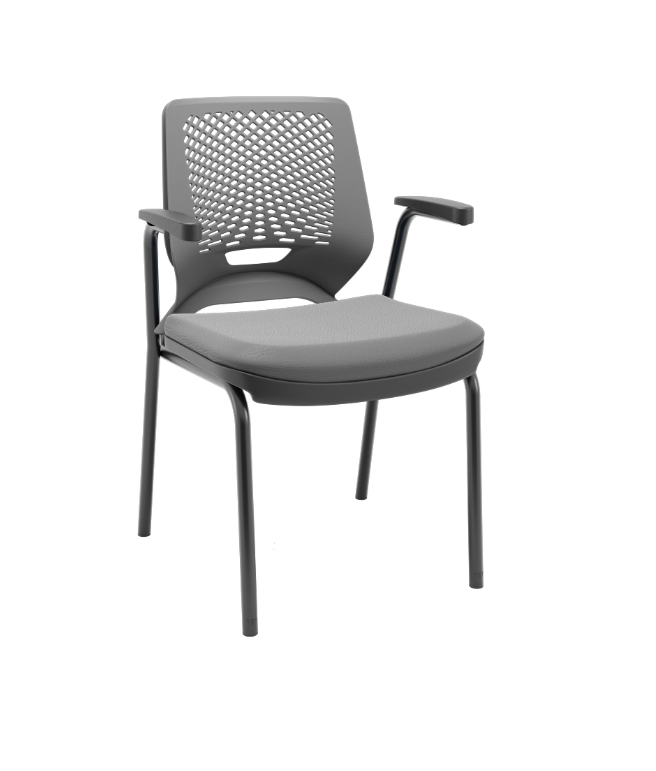 O encosto em resina termoplástica garante leveza, ventilação e durabilidade, enquanto os braços fixos oferecem apoio e melhor ergonomia durante a utilização.