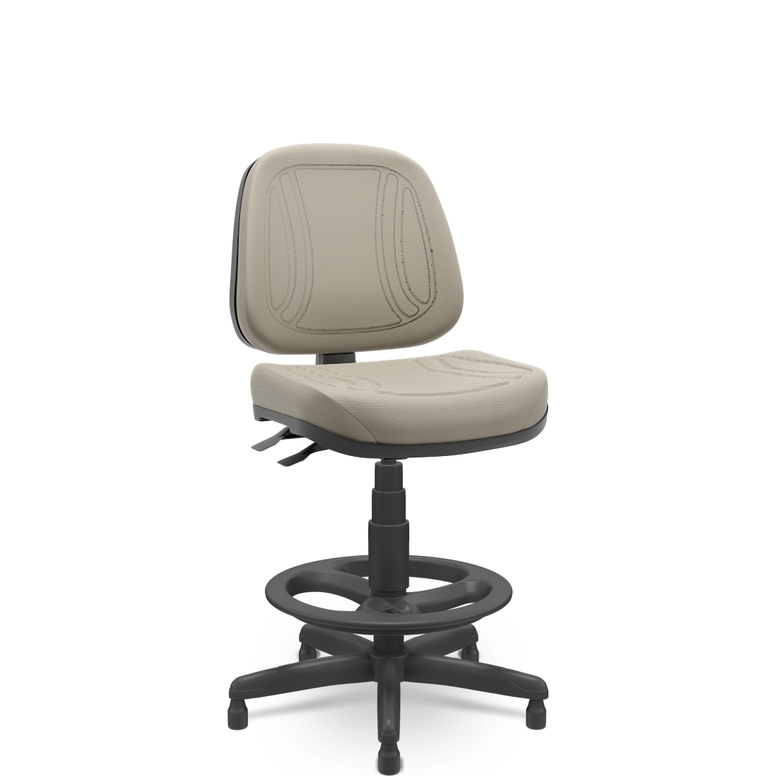 O assento e o encosto são produzidos com espuma injetada de alta qualidade, proporcionando maior conforto e excelente desempenho ergonômico, com revestimento em vinil resistente e de fácil limpeza.